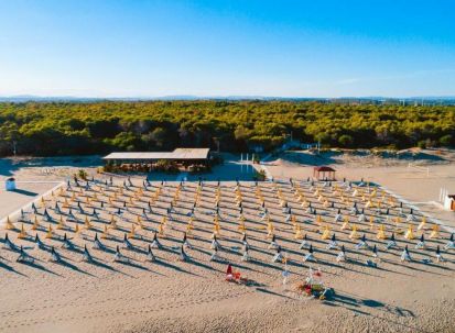 Плажът е част от комплекса с безплатни чадъри и шезлонги за клиентите. За да го достигнете, преминавате през прекрасна романтична зелена борова гора по обособени пътеки, или с минибусчета, които се движат през целия ден. Плажът е дълъг и широк, с фин пясък и безплатни чадъри и шезлонги.