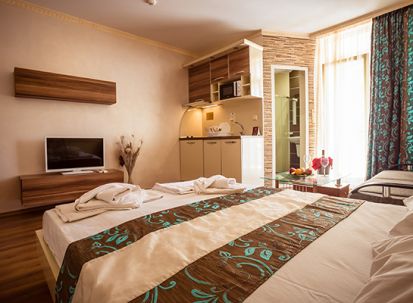 Хотелът посреща гостите си в 130 модерно обзаведени стаи и апартаменти. Студиото е с площ около 25 m2, баня , WC, балкон, климатик, телевизор, хладилник , кухненски бокс ,ел кана, микровълнова печка , спалня с голямо двойно легло , разтегателен диван. Апартамент с 1 спалня е с площ около 55 m2, баня , WC, балкон, климатик, телевизор, хладилник, кухненски бокс, ел.кана, микровълнова печка, спалня с двойно легло, разтегателен диван или единични легла в хола. Двойната стая е с площ около 20 m2, баня , WC , балкон, климатик, телевизор, хладилник, спалня с две единични легла, разтегателен фотьойл