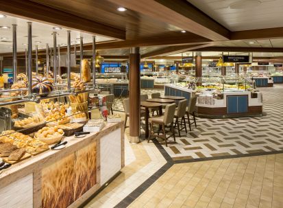Голям избор от заведения за хранене, включени в цената на круиза: Windjammer в който винаги може да грабнете нещо за закуска, обяд или вечеря на самообслужване, The Café at@TW070 предлага супи, салати и сандвичи за закуска и обяд, Dog house за хот дог, Coastal Kitchen с комбинация от средиземноморска и фюжън кухня, Café Promenade отворен 24 часа с леки закуски, сандвичи и кафе, Sorrento`s Pizza, както и основния ресторант Main Dining Room.