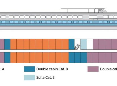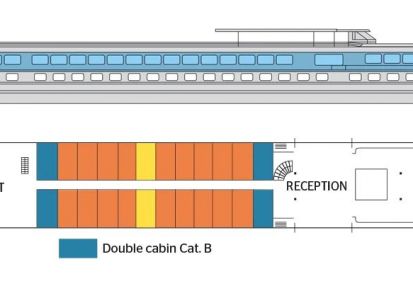 Каютите са общо 67, разпределени на 2 палуби, с площ около 12.50 кв. м. На основната има общо 43 каюти с прозорец. На горната палуба се намират 24 кабини с отварящи се в горната част (плъзгащи) прозорци.