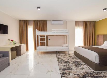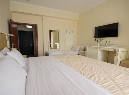 Фамилна или четворна стая: Този вид стаи разполагат с 1 двойно легло и 2 единични легла. Подходящи са за семейства, стаите са просторни. Разполагаме с 8 четворни стаи, като 6 от тях са с изглед към морето. Стаите разполагат с: