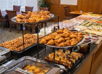 - Закуската е на богат бюфет, включваща пресни плодове, месни и млечни продукти, сладкиши, яйца, зърнени и горещи напитки ;