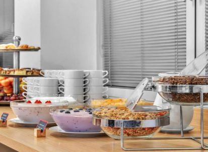 Хотелът разполага със светла зала за закуска, където се предлага континентална закуска на блок-маса – хляб, масло, конфитюр, зърнени храни, колбаси, сирена, плодове, кафе, чай и сокове