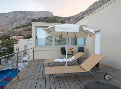 Просторна стая с легло Queen size и двоен разтегателен диван, удобен кът за сядане и невероятен балкон със собствен частен басейн.