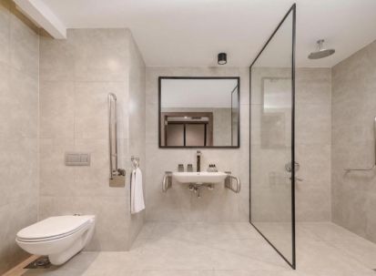 - Голям самостоятелен душ тип тропически дъжд и тоалетна