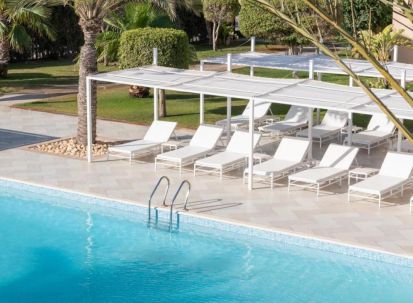 Открит басейн: Басейн с шезлонги и чадъри, предоставящ комфорт и релакс.