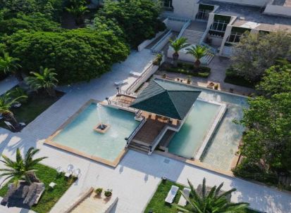- Открит басейн с шезлонги и чадъри