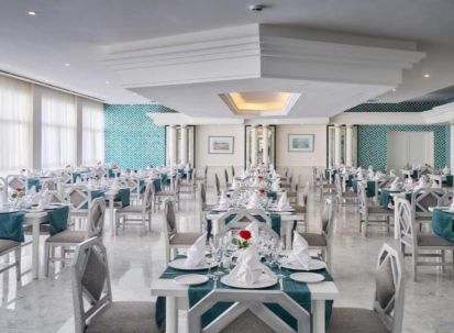 Хотелът разполага с основен ресторант, 1 а-ла-карт ресторант (може да се ползва безплатно веднъж за 7 дневен престой с предварителна резервация), 6 барa, дискотека (напитките са платени), 2 открити басейна, закрит басейн, водни пързалки, СПА център, магазини, анимация, музика на живо, 6 конферентни зали, паркинг. Базата на изхранване е All inclisive - закуска, обяд и вечеря на шведска маса, междинни хранения; местни алкохолни и безалкохолни напитки. Комплексът притежава собствен пяъсен плаж. Чадъри, шезлонги и плажни кърпи на плажа и при басейна се ползват безплатно от гостите. За най-малките посетители са налични детски басейн, с 8 водни пързалки, мини клуб (4 -12 г.), мини дискотека. Безплатен Wi-Fi има на лоби бара и на рецепция.