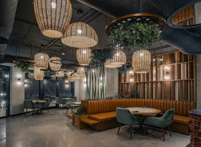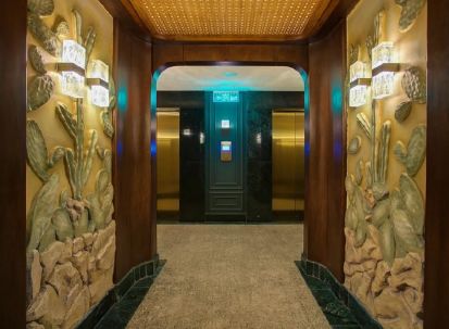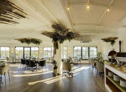 Съвременна сграда с добре поддържана фасада, лоби и ресторант зона („La Firma“), предлагаща природно-успокояваща атмосфера ;