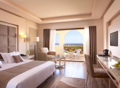 - Superior Rooms- с тераса и размер на стаята 42 м², Всички стаи са с изглед към градина, басейн и море. Капацитет на стаята: Максимум 2 възрастни + 2 деца или 3 възрастни + 1 дете.