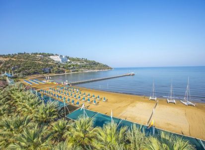 Собствен, пясъчен с дължина 300 м, притежаващ сертификат "Син флаг" и кей със 150 м дължина. Чадъри, шезлонги, матраци и плажни кърпи на плажа и при басейна - безплатно.