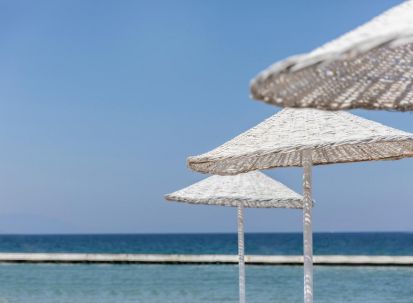 Собствен, пясъчен с дължина 165 м, удостоен със сертификат "Син флаг", оборудван с игрище за плажен волейбол. Чадъри, шезлонги и матраци на плажа и при басейните – безплатно. Плажни кърпи - безплатно.