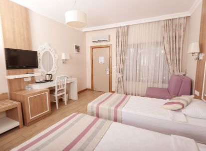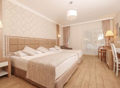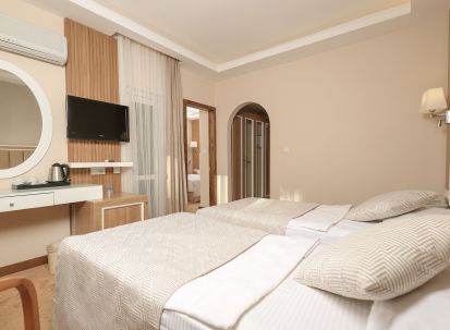 Всички стаи са оборудвани с климатик, телевизор, телефон, баня с душ/вана, сешоар, минибар (безплатно зареждане с вода и безалкохолни напитки ), сет за чай/кафе, сейф (безплатен), балкон или веранда. Почистване на стаите - всеки ден, смяна на спалното бельо и кърпите - 3 пъти в седмицата.