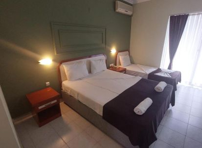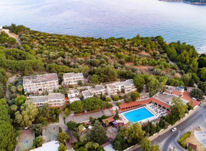 Собствен, пясъчно-чакълест, на 250 м. от хотела. Чадъри и шезлонги на плажа и при басейна – безплатно.