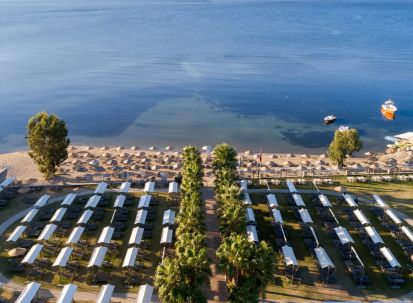 Собствен, пясъчно-чакълест с дължина на плажната ивица 95 м. Чадъри, матраци и шезлонги при басейна и на плажа, плажни кърпи - безплатно.