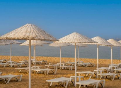 Собствен, пясъчно - чакълест с дължина 650 м. Чадъри, шезлонги и плажни кърпи на плажа и при басейна – безплатно.
