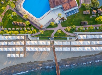 Собствен – пясъчен. Чадъри, шезлонги, матраци на плажа и при басейна – безплатно.