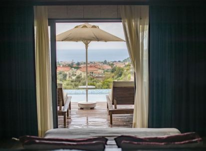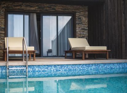 Собствен, пясъчен. Хавлии, шезлонги и чадъри при басейна - безплатно. На плажа - шезлонги и чадъри - безплатно, хавлии - платено. Безплатен шатъл до плажа.