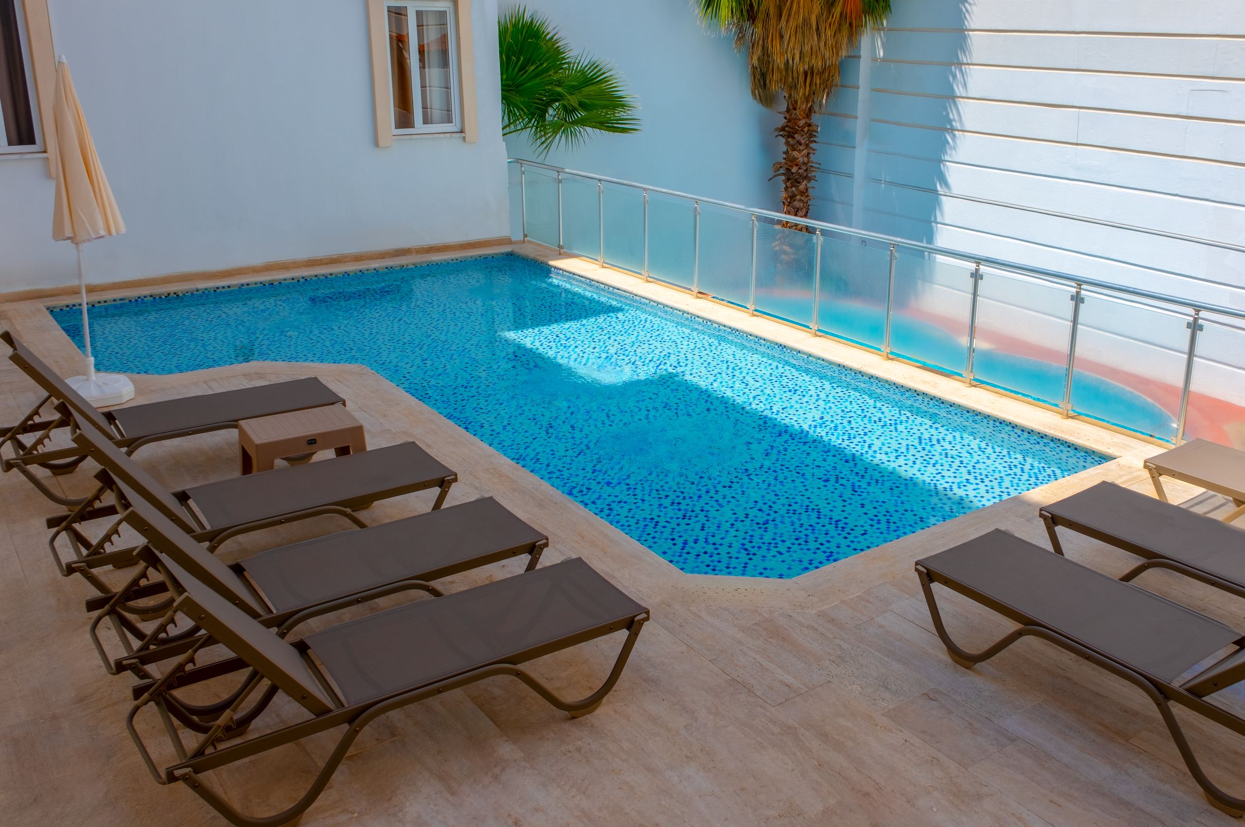 Собствен, пясъчен. Чадъри, шезлонги и матраци на плажа и при басейна – безплатно.